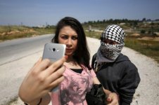 Palestiniana tira uma selfie no meio de confrontos com as forças de segurança de Israel